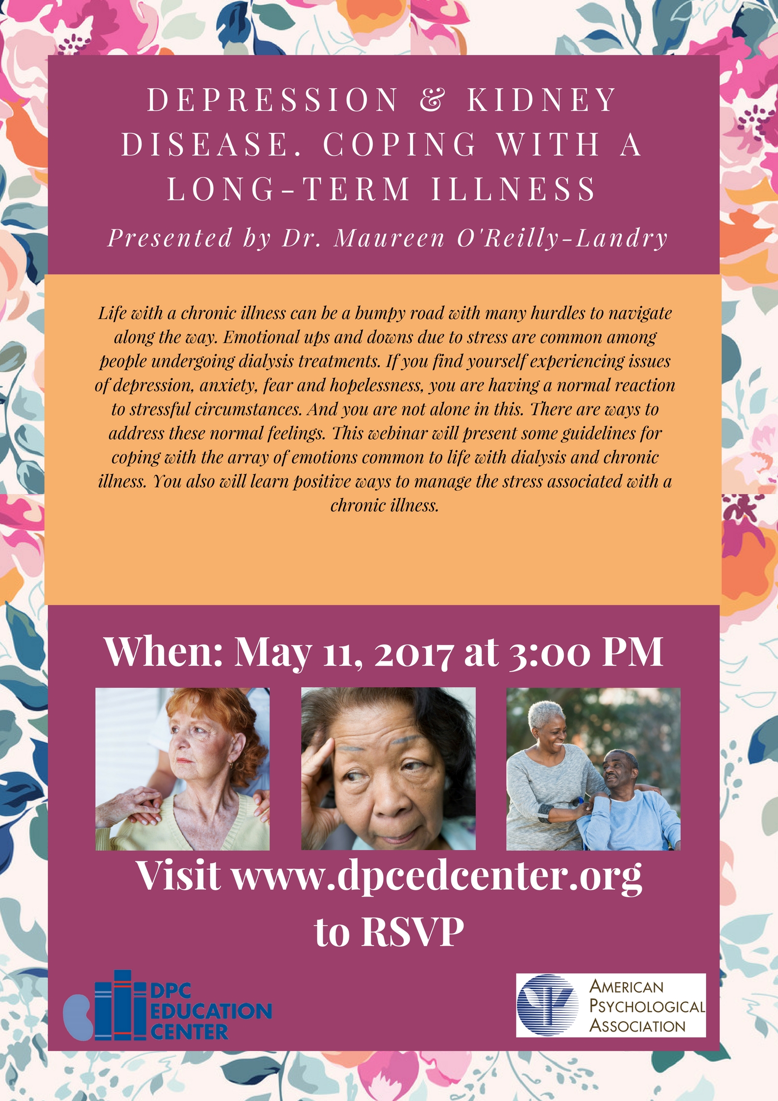 Life with a chronic illness can be a bumpy road with many hurdles to navigate along the way. Emotional ups and downs due to stress are common among people undergoing dialysis treatments. If you find yourself experiencing issues of depression, anxiety, fear and anger, you are having a normal reaction to stressful circumstances. And you are not alone in this. Yet, despite being surrounded by other people, a sense of isolation may arise. There are ways to address these normal feelings. This webinar will present some guidelines for coping with the array of emotions common to life with dialysis and chronic illness. You also will learn positive ways to manage the stress associated with a chronic illness.