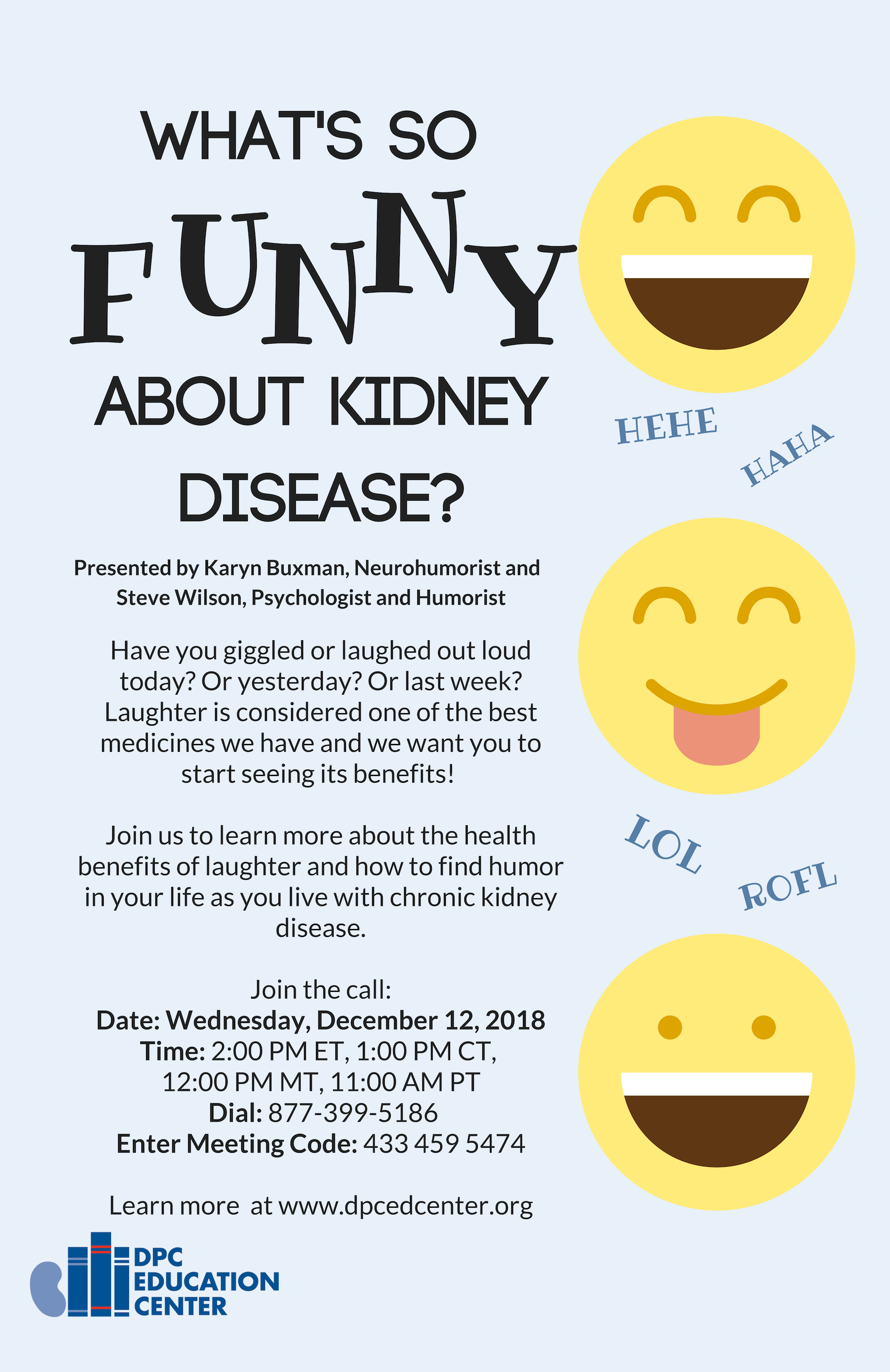 Join us on Wednesday, December 12 at 2:00 pm (Eastern) to learn more about the health benefits of laughter and how to find humor in your life as you live with chronic kidney disease.